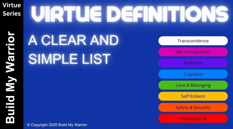 Here you can find our ‘Virtue Definitions Breakdown: A Clear and Simple List’. These definitions are not from a particular dictionary. Nor are they the final definition according to Build My Warrior. They are a general understanding in basic terms, as an easy reference guide, without our usual explanation, or methodology on how to implement them. If you want an easy look up guide, please start here.